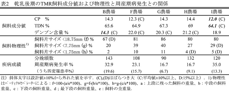 - 乾乳後期にTMR方式で飼料を給与している5農場において、乾乳後期用飼料の成分と物理性を調べたところ、飼料設計値と分析値の差が大きい農場(B、F、I)、あるいは飼料片サイズの変動が大きい農場(B、I)が見られる。これらの農場では周産期病が多発していたことから、設計したとおり適正に飼料が調製されているかどうかを評価することは、周産期病を低減するための重要なモニタリング項目の一つである(表2)。