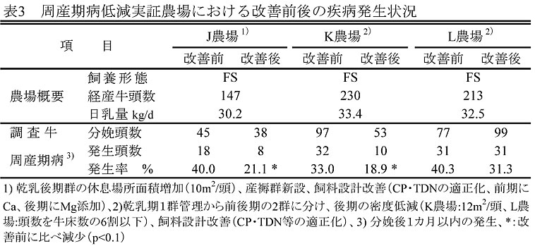- 周産期病の発生率が高い3農場(フリーストール飼養・TMR給与)において、乾乳期(前期・後期)および産褥期の群分け、休息スペース確保、ならびに飼料設計の見直し(分析値に基づきCP・TDN等の適正化、ミネラル添加)を中心に改善を実施することで、周産期病の発生率低減が実証されている(表3)。これら改善項目は周産期病予防のための重要なチェック項目である。