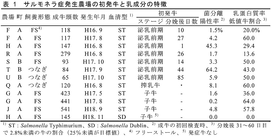 - 道内AおよびB町のSal症発生農場は、非発生農場に比べて飼養頭数が有意に多く(138頭±131頭 vs 63頭±33頭、P<0.05)、飲水器の洗浄頻度が少ない傾向にある。初発牛やSal陽性牛は泌乳前期牛(0〜100日)に多く(表1)、発生農場で認められる泌乳初期牛(31〜60日)の乳蛋白質率の低下(表1)、すなわちルーメン機能の減退から菌体蛋白合成能が低下した状態にあることが発症要因に関与していると考えられる。