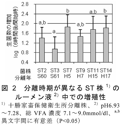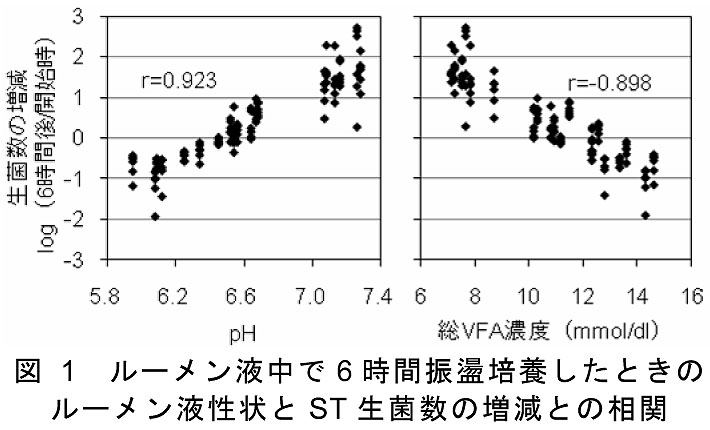 - 飼料給与条件が異なる牛のルーメン液を用い、S. Typhimurium(ST)6株を39℃で6時間振盪培養したところ、ルーメン液のpHおよび総VFA濃度と生菌数の増減との間に高い相関が認められる(図1)。生菌数は16時間の絶食後に得た高pH、低総VFA濃度のルーメン液中で最も増加し、ルーメン内環境を同様の状態にする飼養条件は、Sal症の発生要因になると考えられる。さらに、平成5年および17年分離株のST7およびST14は、昭和61年分離株のST3よりもルーメン液中で増殖しやすく、この増殖性の違いが近年のSal症多発の一要因となっている可能性がある(図2)。