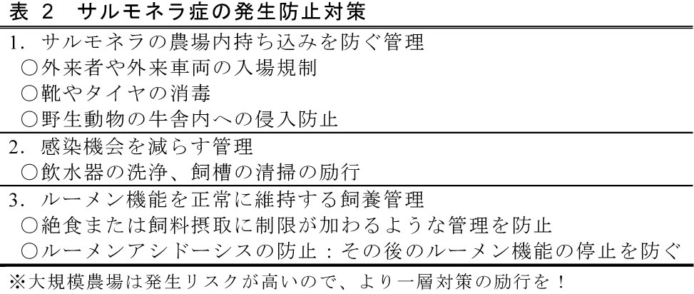 - Sal症の発生防止のためには、Salの農場内持ち込みを防ぐ管理や牛への感染機会を減らす管理とともに、ルーメン機能を正常に維持する飼養管理、すなわち絶食または飼料摂取に制限が加わるような管理の防止やルーメンアシドーシス(その後のルーメン機能の停止)を防ぐ管理が特に重要である(表2)。