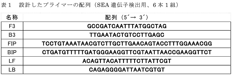 - 検出時間が短く特異性ならびに検出感度が高いSEA産生黄色ブドウ球菌検出用LAMP法を開発するためループプライマーを含むプライマー6本を作製し、有用性の検討を行う(図1、表1)。本プライマーを用いる場合のLAMPの最適反応温度は61℃である。