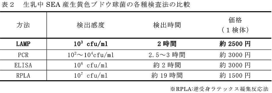 - 開発したLAMP法は、生乳中の菌数が1,000 cfu/mlあれば100%検出可能である。また、検出時間が2時間であり他の検査手法より短時間で検査できる(表2)。