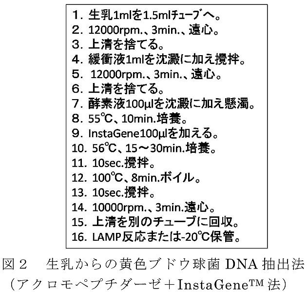 - 生乳からのSEA産生黄色ブドウ球菌のDNA抽出法は、溶菌酵素であるアクロモペプチダーゼとDNA抽出試薬InstaGene を組み合わせる方法を用いた場合に、LAMP法の検出感度が最も良好である(図2)。