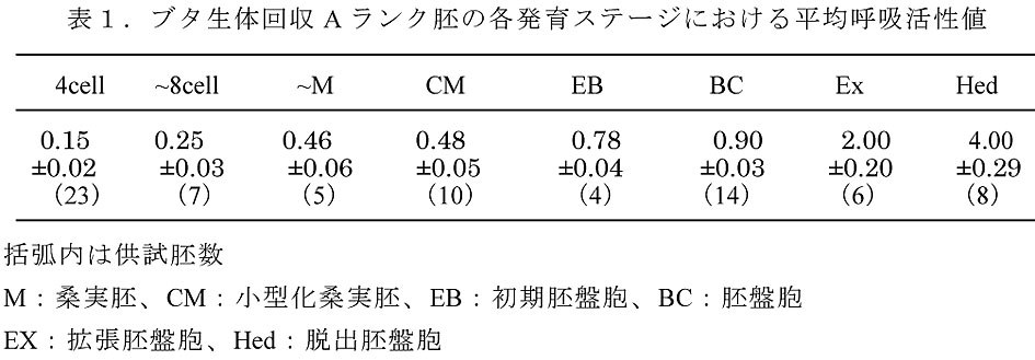 - 生体回収したブタ初期胚の呼吸活性値を表1および図1に示す。