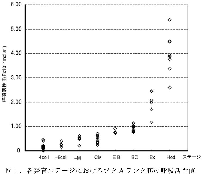 - ブタ生体回収胚の呼吸活性値は、胚盤胞以降急激に上昇する。これは胞胚腔の形成、拡張期に代謝量が上昇し、結果として呼吸活性値が上昇しているためである。