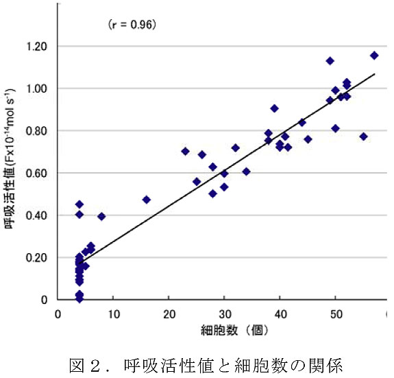 - 呼吸活性値と細胞数の間に極めて高い相関(r=0.96)が存在する(図2)。