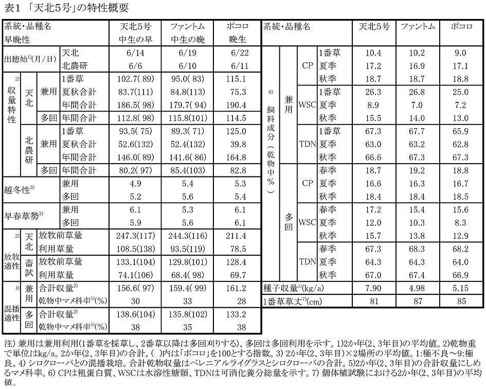 「天北5号」は中生の早に属し、兼用利用で1番草の採草とその後の放牧の開始を早く行える。中生種としては兼用利用で採草1番草収量が多く、晩生品種と比べ夏以降の多回利用時の収量も多い。飼料成分や放牧時の採食性は良好である。種子収量が多い。