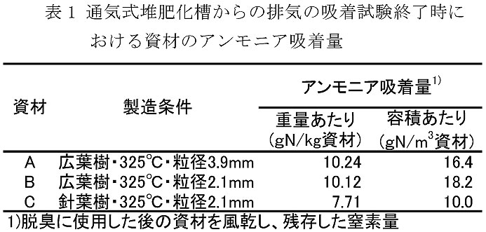 熱処理された木質チップを充填した脱臭槽に通気式堆肥化槽からの排気を通すことで高いアンモニア捕集効果が得られる。アンモニア捕集に使用後のチップの土壌施用により土壌物理性改善効果が認められ、作物生育に対する効果は堆肥と同等である。