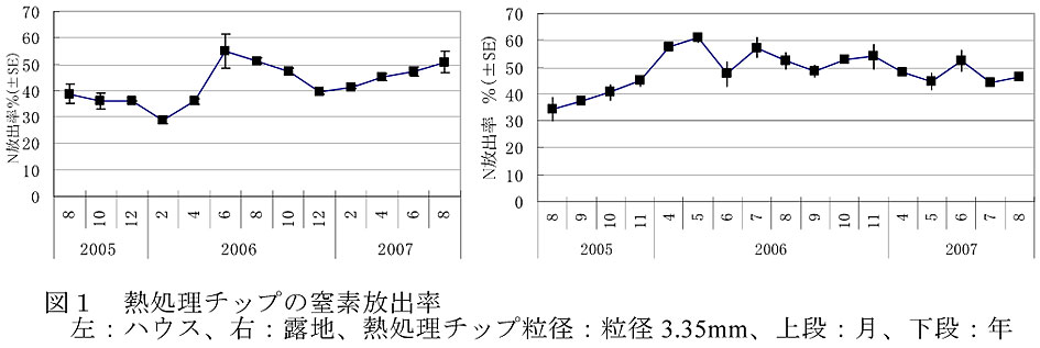 - 熱処理チップの土壌中における窒素放出率は、ハウス(アルストロメリア)、露地(アスパラガス)ともに、施用後6ヶ月で30〜40%、以降で50%程度となり(図1)、熱処理チップの吸着窒素量を10gN/kgとすると、窒素放出量は1tあたり初年目3〜4kg、2年目1kgと予想される。そこで、熱処理チップの施用量は、窒素放出量が各作物に標準量を施用したときの堆肥からの窒素放出量(アルストロメリア8kgN/10a、アスパラガス10kgN/10a)とほぼ同等になる2t/10aが適当である。