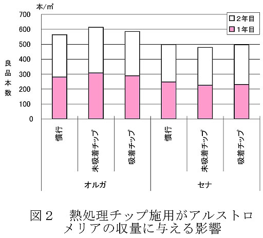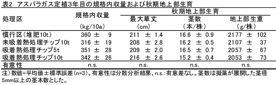 - アルストロメリアの栽培において、熱処理チップを堆肥と同重量施用した場合の収量および切り花品質は堆肥と同等である(図2)。アスパラガス定植時に土壌改良資材として熱処理チップを施用し、定植初年〜3年目の地上部生育および収穫調査を実施した結果、生育および収量は慣行区(堆肥10t施用区)と同等である(表2)。