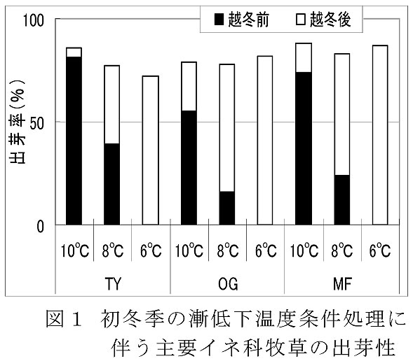 - 4日で1℃ずつ低下する温度条件において、チモシーは日平均温度6℃以下で播種すると越冬前出芽を回避出来(図1)、一時的昇温については、日平均気温7℃で3日間続くと越冬前に半数程度の種子が出芽する危険がある。