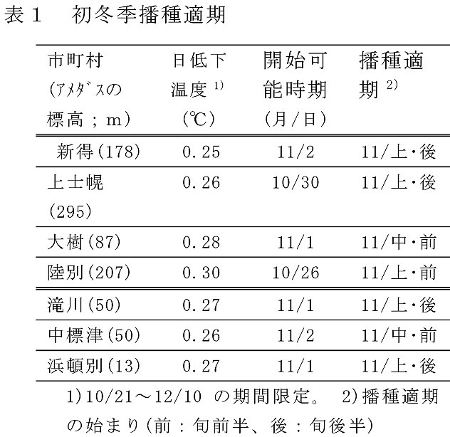 - 十勝管内各地のアメダス気温データによると初冬季の日平均気温は約4日で1℃ずつ低下する。一時的な気温上昇の出現の終息時期には地域毎に一定の傾向がみられることから、前記1)の低温出芽性を基に、越冬前出芽を回避して安定的に早春の出芽・定着が見込まれる「初冬季播種適期」を町村毎に設定した(表1)。この事は、播種期間の2〜4週間の拡大を意味する。