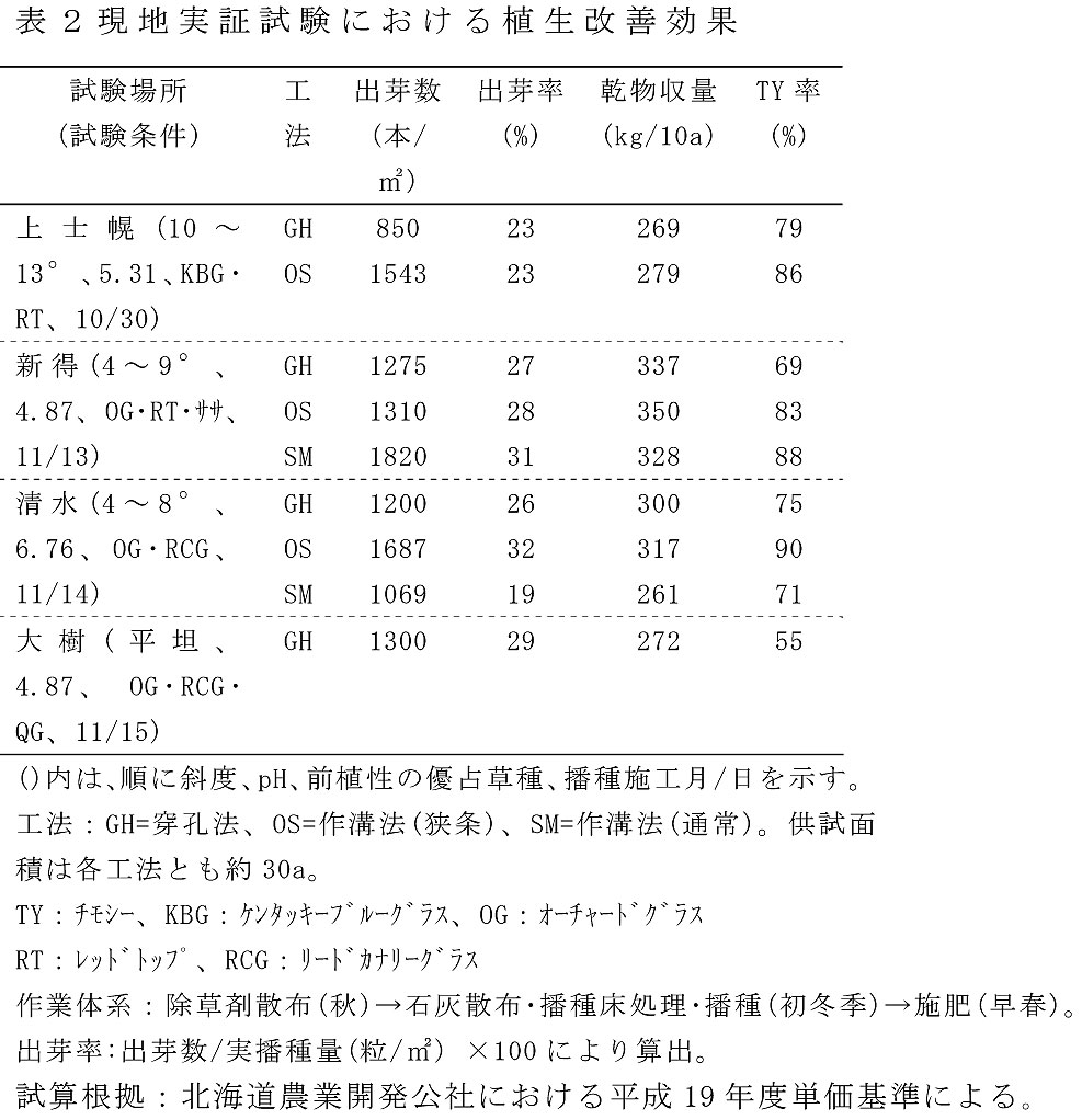 - 簡易更新・初冬季播種による現地実証試験は、1試験地を除き1番草で概ね75%以上のチモシー率が得られ、かつ乾物収量も通常の完全法における更新当年1番草と同程度であることから(表2)、「初冬季播種適期」の有効性が認められる。