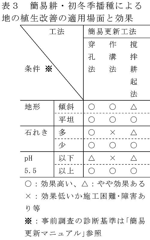 - 以上の知見をもとに、傾斜地等の条件不良草地に対する各種工法の適用場面と効果を相対的に整理して示す(表3)。