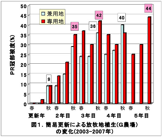 (2)放牧地は兼用地を有効に活用し、植生改善は初期生育の早いPRと作溝型播種機を組合せた簡易更新法で実施し、放牧を継続しながら2〜3年目で十分な効果が見られる(図1)。