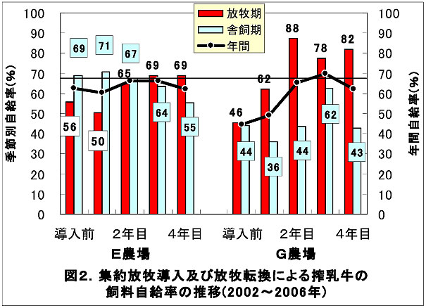(3)両農場は放牧依存率を高め、搾乳牛で年間60%以上の高い飼料自給率を維持し(図2)、植生改善と短草利用は、放牧地からの乳生産を高めた効率的放牧地利用を達成できる。