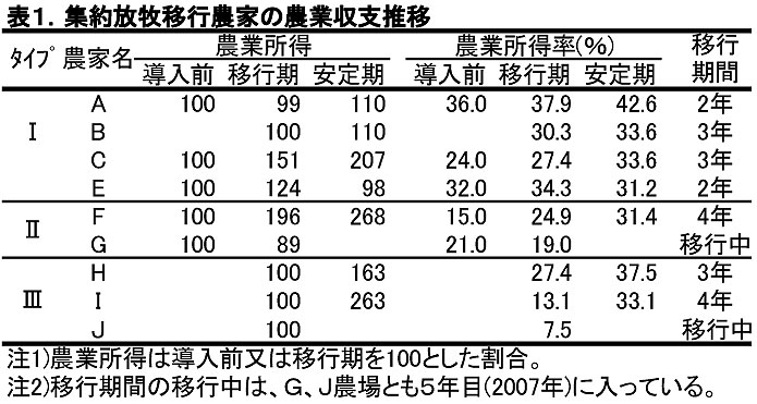 (3)移行に必要な年数は、タイプTが2〜3年、タイプUとVは4〜5年程度である。農業収支では、放牧関連の施設整備やPR導入など植生改善を数年かけて実施し、放牧牛の採食程度判定など放牧技術の習得により、所得率が向上し農業所得の増加が見られる(表1)。