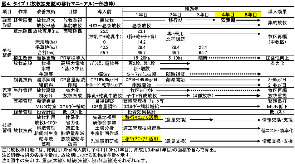 (1)農家実証と先進的放牧酪農経営の調査結果より、営農条件別に道北型集約放牧への移行マニュアルを作成し、一部抜粋を示す(図4)。
