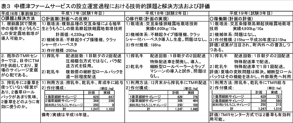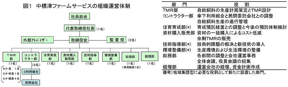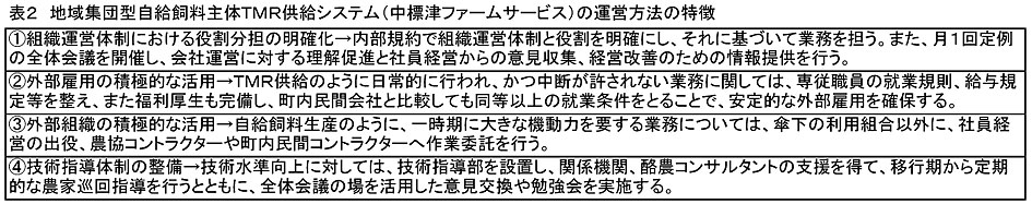 - 地域集団型のTMR-Sの運営方法は、中標津ファームサービスの事例が示すように、会社運営に関して過度に一部の農家に負担が掛からないような体制(組織運営体制における役割分担の明確化、外部雇用および外部組織の積極的な活用)を整備するとともに、技術水準を早期に一定レベルまで到達させるような技術指導体制を整備することが重要 になる(図1、表2)。