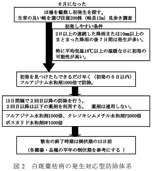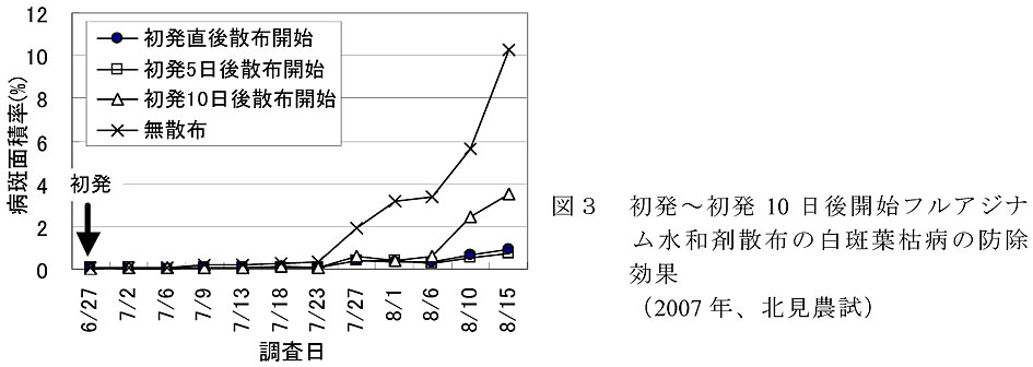 - 本病防除には初発期の薬剤散布が重要で、フルアジナム水和剤1000倍散布を初発〜初発5日以内に行うことで最も高い効果が得られる(図3)。