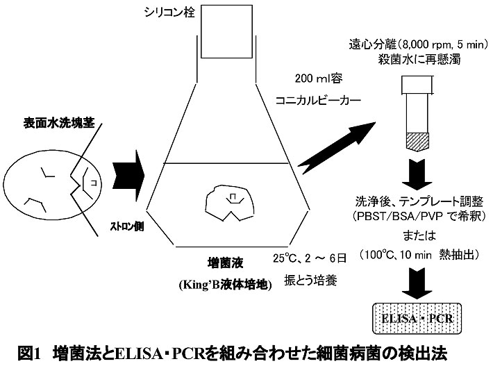 - 上記の増菌法とELISAを組み合わせた検定法は、輪腐病菌を除く、他の病原菌の検出に、また増菌法とPCRを組み合わせた検定法は、上記全ての菌種の保菌塊茎からの検出を可能にする。