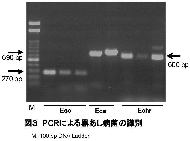 - PCRによる検定では、EchrについてはSmid et al. (1995)、EcaについてはDe Boer and Ward (1995)、輪腐病菌についてはLee et al. (1997)の各方法を用いる。これまで報告のなかったEccに対しては、新たに設計したプライマー(堀田・田中 2007)を用いて検出が可能である(図3)。