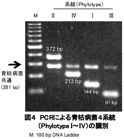 - ジャガイモに病原性を示す青枯病菌4系統(phylotype I〜IV)を共通に、または個別に識別するために設計されたプライマー(Ito et al. 1998、Fegan and Prior 2005、堀田 2006) を用いたPCRは識別性が高く有効である(図4)。