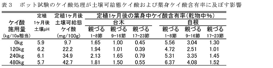 - ポット試験によるケイ酸の高濃度施用では、可給態ケイ酸の濃度は上昇し、葉身のケイ酸含有率も高まる傾向にあった(表3)。