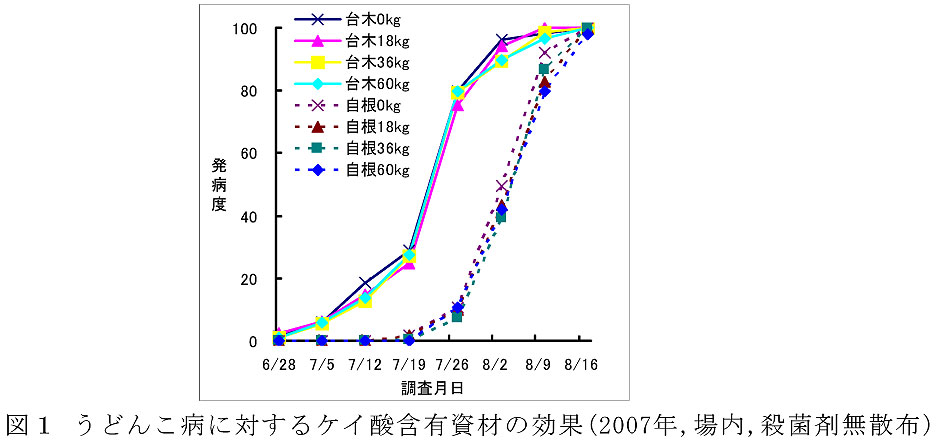 - 自根栽培では、台木栽培と比べ葉身のケイ酸含有率が高く(表2)、うどんこ病の初発は遅くなったが、施用量の違いによる発病の差はなかった(図1)。自根の発病度は初発が遅れた分、初めは低く推移したが、8月上旬以降は台木栽培とほぼ同様甚発生となった(図1)。