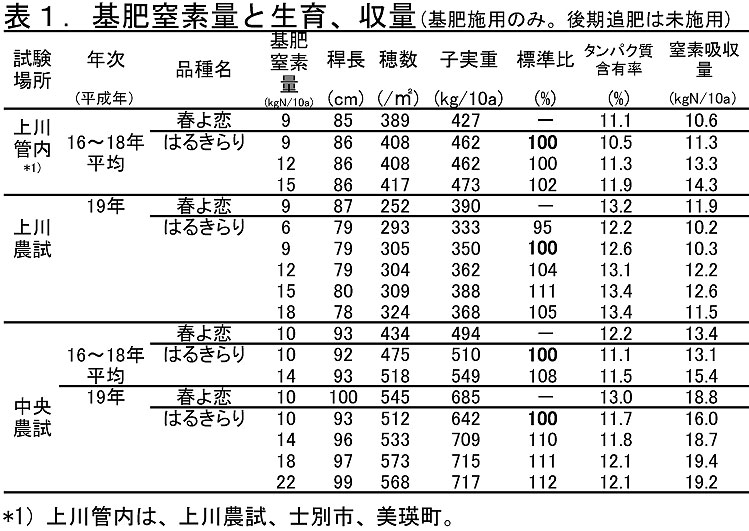 - 本成績は全道の春まき小麦栽培地帯に適応し、「はるきらり」栽培に当たっての基本的な栽培技術として利用する。
