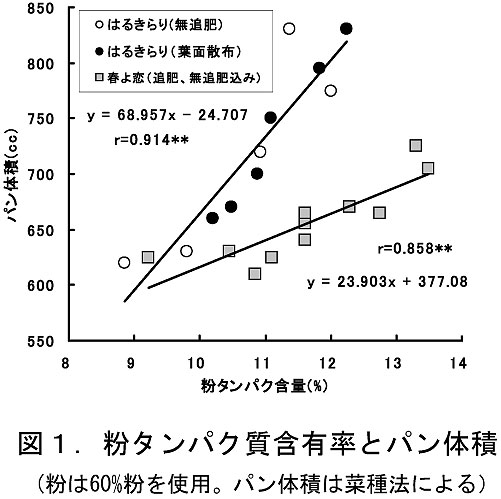 - 基肥窒素量の増肥、葉面散布、硫安表面施用の方法にかかわらず、タンパク質含有率の向上に伴い、生地物性は向上し、パン体積も増加する。この時のパン体積の増加程度は「春よ恋」よりも大きい(図1)。