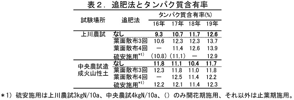 - 止葉期以降の後期追肥を行うことで、タンパク質含有率は向上し、子実重も増加する。上川地域では、開花期以降3回の尿素葉面散布(1回につき0.92kgN/10a)、道央地域では同4回の葉面散布または止葉期の硫安表面施用(4kgN/10a)でタンパク質含有率が1ポイント程度向上する(表2)。