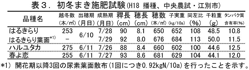 - 初冬まき栽培では、「ハルユタカ」の標準施肥量(融雪期10kgN/10a+止葉期6kgN/10a)を基本とし、春まき栽培と同様に、開花期以降3〜4回の尿素葉面散布を行うことで、タンパク質含有率を確保する(表3)。