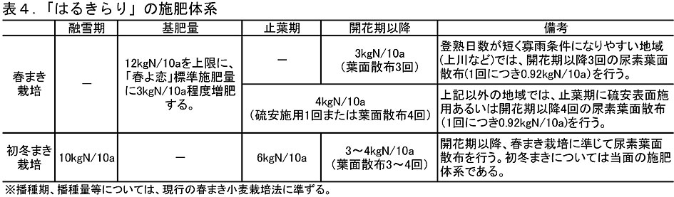 - 以上の結果から、「はるきらり」の施肥体系を表4に示す。