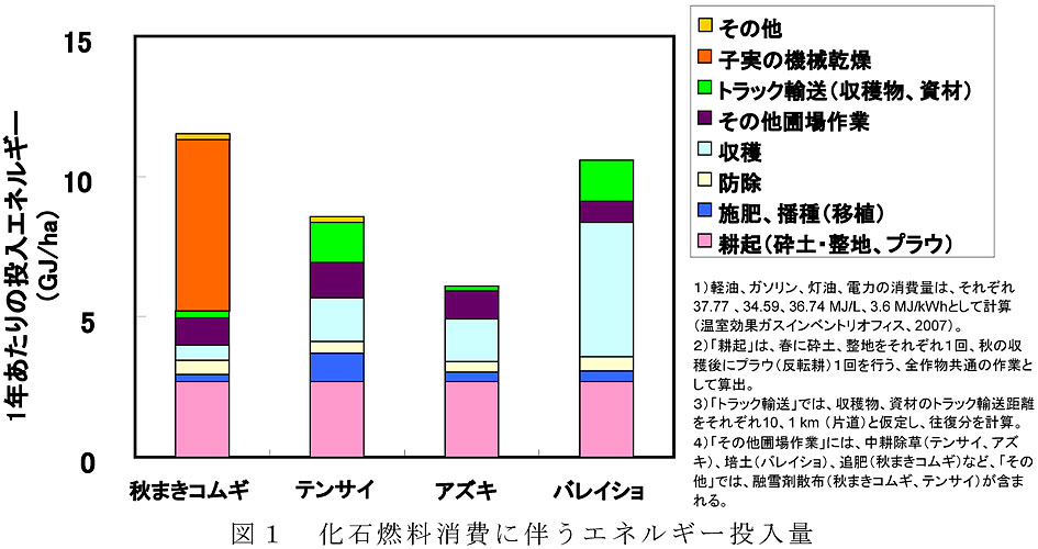 - 圃場作業、収穫物のトラック輸送、コムギの機械乾燥など、燃料消費作業におけるエネルギー投入量は、1年あたり6.1 (アズキ)〜11.5 (秋まきコムギ) GJ/haである(図1)。