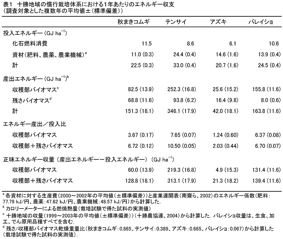 十勝地域の一般的な栽培体系では、化石燃料や資材の消費に伴うエネルギー投入量は1年あたり20.7〜33.0 GJ/haであるのに対し、収穫部のバイオマス生産に伴うエネルギー産出量は25.6〜252.3 GJ/haである。収穫部バイオマスについて、テンサイやバレイショはエネルギー産出/投入比および正味エネルギー収量が高く、エネルギー生産効率が高い。