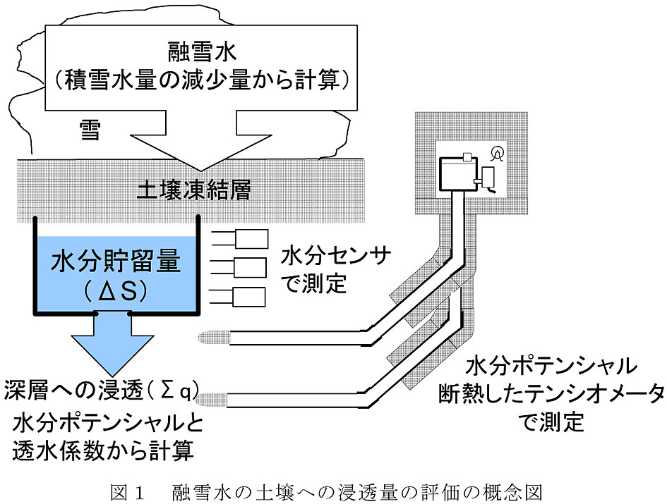 - したがって、表層土壌の透水性が高い場合には20cm程度の土壌凍結層が発達しても融雪水の浸透量は土壌が凍結していない場合と同じと考えてよい。