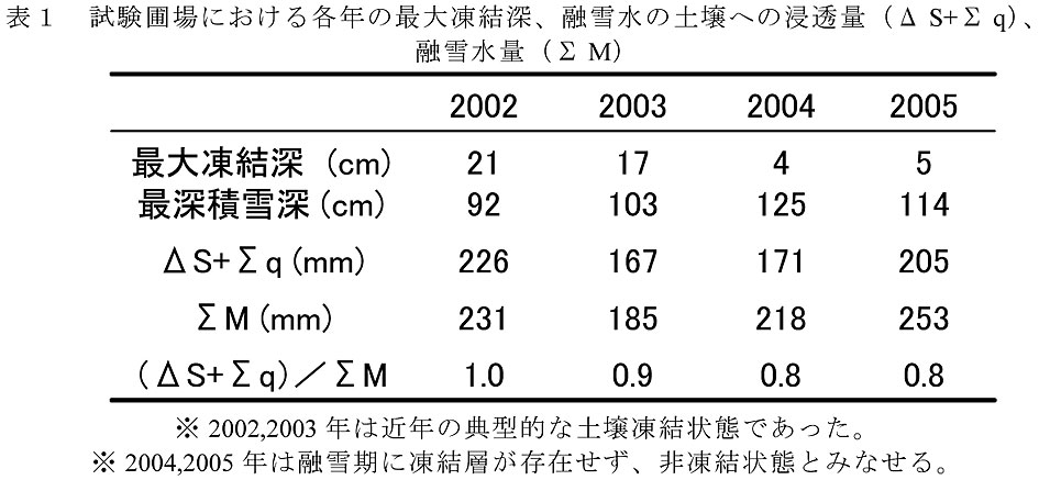 - 土壌凍結深が20cm程度発達した年(2002年と2003年)も、凍結しなかった年(2004年と2005年)も、融雪水量(ΣM)に対する浸透量(ΔS+Σq)の割合は0.8〜1.0であり、ほぼ等しい(表1)。