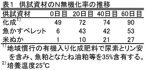 - 魚かすは分解によるNの放出(N無機化)が速い速効性の資材であり、米ぬかはNの放出が遅い緩効性の資材である(表1)。