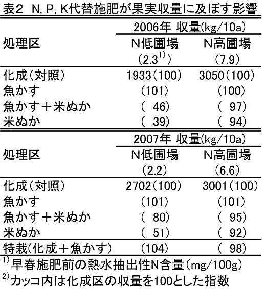 - 「魚かす+米ぬか」区の果実収量は、N肥沃度の高い圃場では対照とほぼ同等であるが、N肥沃度の低い圃場では対照に比べて低下する(表2)。