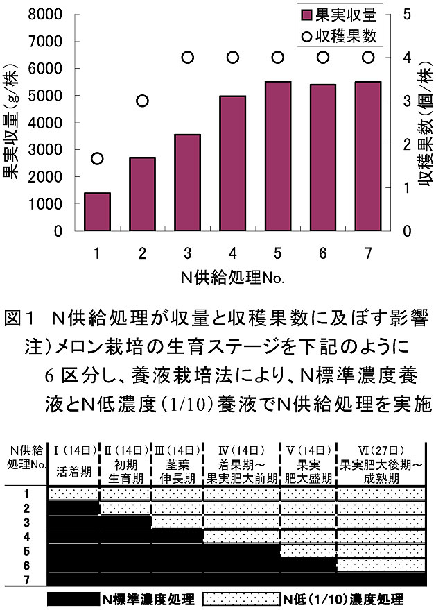 - 養液栽培法によるN供給処理では、果実肥大前期(生育ステージW)までのN標準処理期間が長いほど果実収量は高い(図1)。また、処理5、6の果実収量と処理7は同等であることから、果実肥大盛期(ステージX)と果実肥大後期〜成熟期(ステージY)のN供給は果実収量の増加に大きく寄与しない。このことから、メロンのN供給重要期は定植〜果実肥大前期(定植後約60日)である。