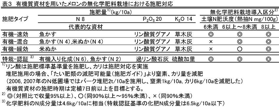 - 本成績はメロンの無化学肥料栽培、特別栽培農産物認証基準に準拠した有機質資材の施肥対応として活用し、またクリーン農業技術にも利用できる。
