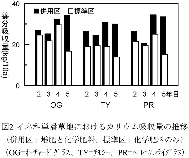 - 併用区の更新2〜5年目におけるイネ科単播草地の収量(図1)、シロクローバまたはアルファルファを混播したマメ科混播草地の収量(更新2〜5年平均約990kg/10a)、および各草地の主体草種割合の推移(データ非表示)は、標準区と同程度に維持される。一方、養分吸収量の内、更新4〜5年目のカリウム吸収量は併用区で多い(図2)。