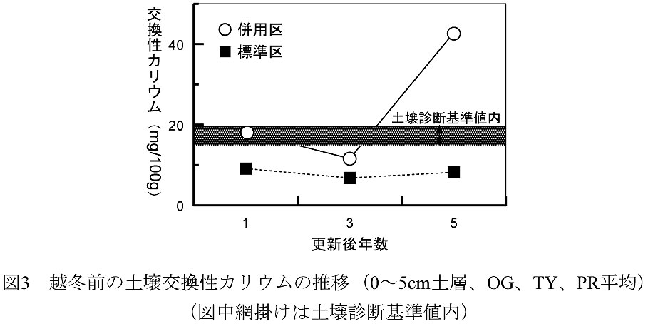 - 更新5年目は併用区の交換性カリウム(図3)、有効態リン酸が高く、土壌診断による減肥対応によりカリウム供給量を控え、飼料品質〔K/(Ca+Mg)当量比〕が2.2を越えないように調整する必要がある。