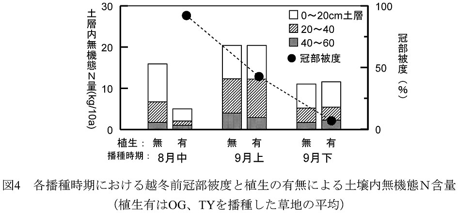 - 播種時期と越冬前冠部被度の関係では、8月中旬播種は冠部被度が高く、土壌無機態N含量が少ない。それ以降の播種時期は冠部被度が低く、裸地と等しい土壌無機態N含量である(図4)。よって、越冬前までに植生を確保し、土層内の無機態N量を少なくするための播種時期は8月末までが望ましい。