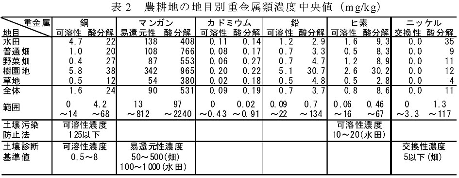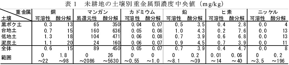 未耕地の可溶性銅および易還元性マンガン濃度は、土壌区分間に有意差が認められる。農耕地の銅、マンガン、ヒ素、ニッケル含量の中央値は各種の基準値を満たしているが、営農活動に起因した重金属類の負荷が認められる。