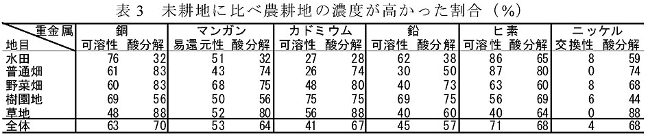 - 未耕地に比べ農耕地の濃度が高い地点の割合は、交換性ニッケルを除くと、各重金属類とも地目全体で41〜71%である(表3)。