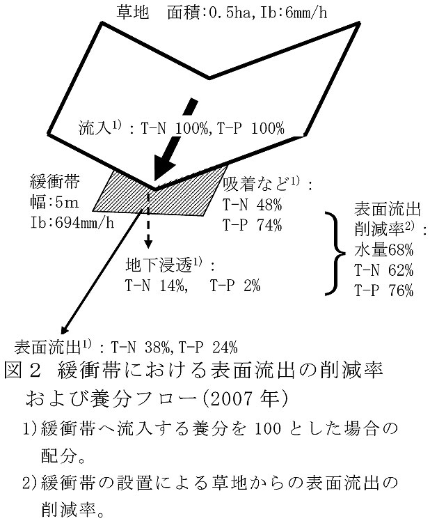 2) 草地から表面流出水が系外に流出する場所に設置した浸入能の高い緩衝帯(幅5m、Ib:694mm/h、図1)は、集水面積約0.5ha、Ib: 6mm/hの草地から表面流出する水量、全窒素量および全リン量を各々68%、62%および73%削減する(図2)。この時、全リンの地下浸透量は流入量の2%と非常に少ないが、全窒素は14%が地下浸透する(図2)。