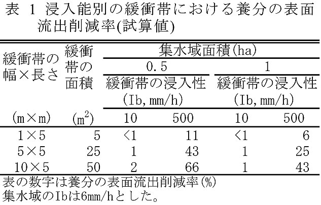 3)緩衝帯による養分の表面流出削減は、Ibの小さい緩衝帯を広く設置するより、小面積でもIbの大きい緩衝帯を設置する方が土地利用上効果的である。また、集水域面積が広いなど緩衝帯への流入水量が多い条件では削減率の低下が予想される(表1)。